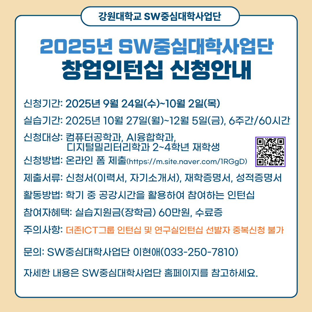 [모집]2025년 SW중심대학사업단 창업인턴십 참여학생 신청 안내
