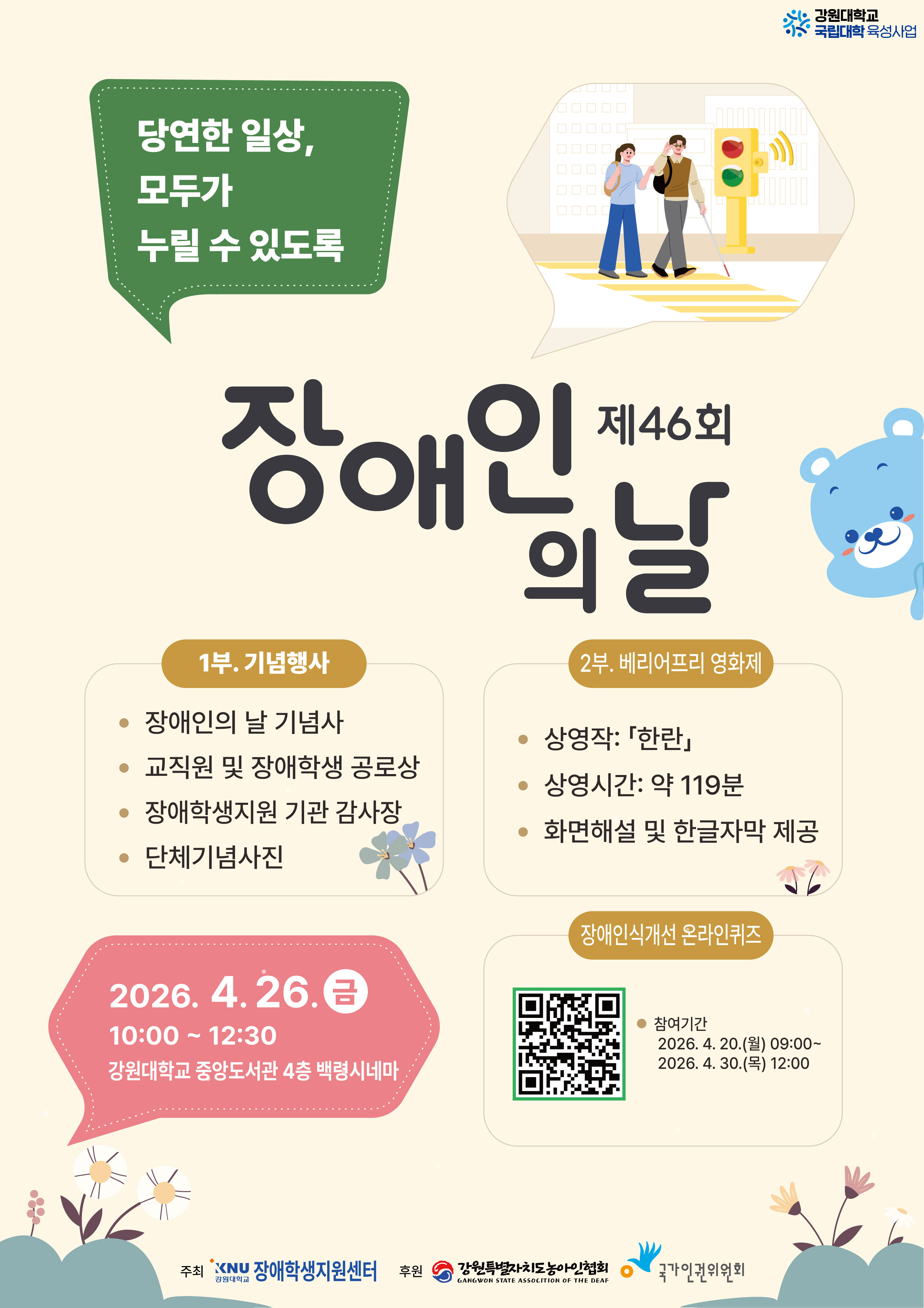 2026년 장애인의 날 기념행사 및 배리어프리 영화상영회를 다음과 같이 개최하오니 재학생 및 교직원 등 구성원들의 많은 관심과 참여를 부탁드립니다.