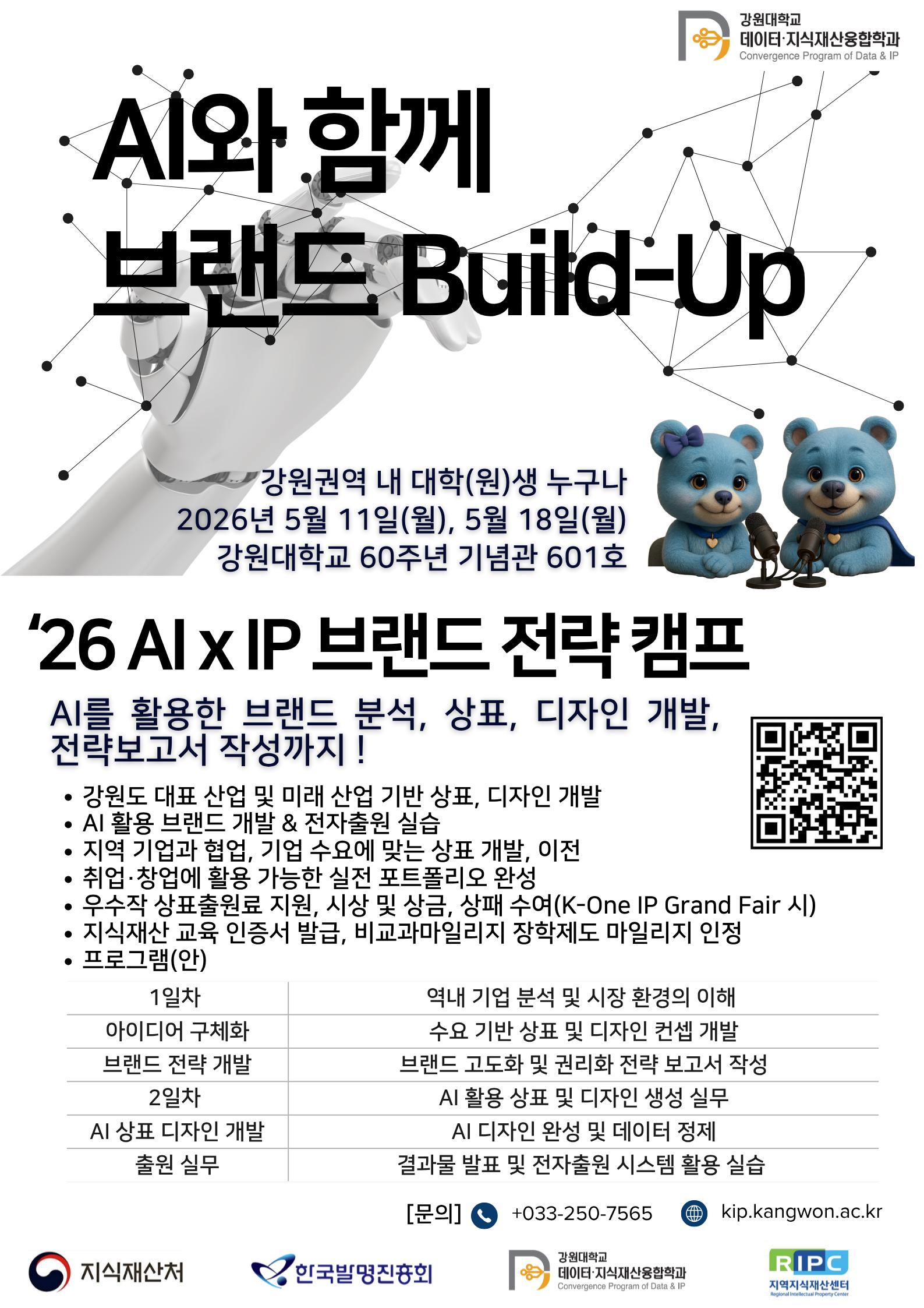강원대학교 지식재산전문인력양성중점대학사업단에서는 대학(원)생에게 역내 기업 분석, 수요를 반영한 상표 및 디자인 개발, 브랜드 전략 개발의 기회를 제공하는 ‘강원지역 산업 연계 「2026 AI x IP 브랜드 전략 캠프」’를 실시하오니 관심있는 학생의 참여바랍니다.